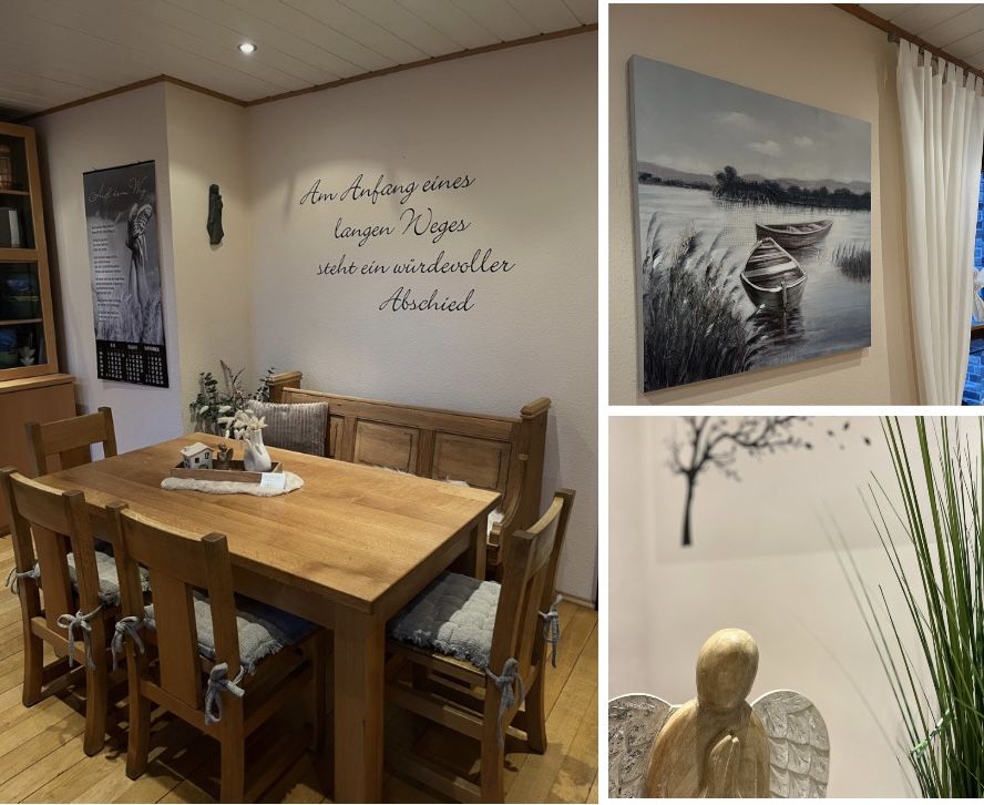 Egal zu welcher Uhrzeit: Wir sind bei einem Trauerfall immer für Sie erreichbar. Gemeinsam besprechen wir gerne bei Ihnen zu Hause oder in unseren Räumlichkeiten, welche Maßnahmen getroffen werden müssen sowie das Wann, Wo und Wie der Trauerfeier und Beisetzung. Außerdem sind wir Ihnen bei der Auswahl der Trauerkarte und des Inhaltes behilflich. Wenn Sie ein eigenes Motiv wünschen, gestalten wir eine Trauerkarte auch nach Ihren individuellen Vorstellungen. Den Trauerdruck erledigen wir schnell und unkompliziert in unserem Hause. Wir unterstützen Sie ebenfalls bei der Gestaltung der Traueranzeige für eine Tageszeitung sowie bei der Wahl eines Sarges bzw. einer Urne. In unserer Sarg- und Urnenausstellung können Sie sich in Ruhe umsehen. Wir beraten Sie gern und beantworten Ihre Fragen.